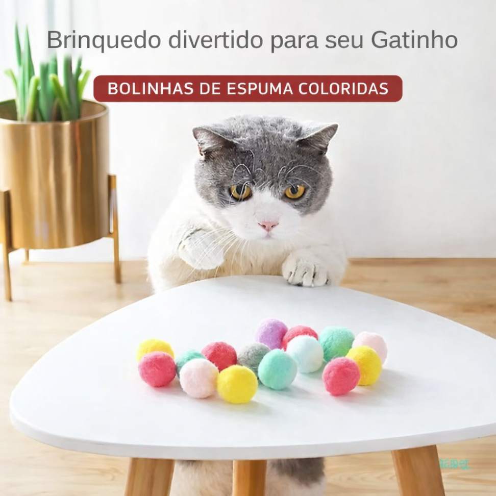 As bolinhas são feitas de espuma macia, leves e seguras, ideais para jogar, perseguir, agarrar e morder, respeitando a sensibilidade dos dentes e patas do seu gato 🧶🐾.